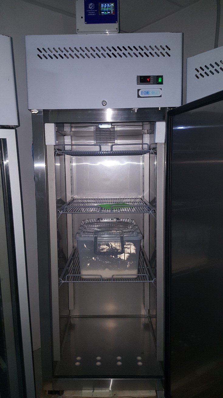 Armadio frigorifero professionale in acciaio inox a norme alimentari, provvisto di controllo elettronico di temperatura ed umidità con programma sequenziale, per impostazioni di tempo e gradazione, delle funzioni di fermo-lievitazione, rinvenimento a temperatura ambiente e lievitazione.